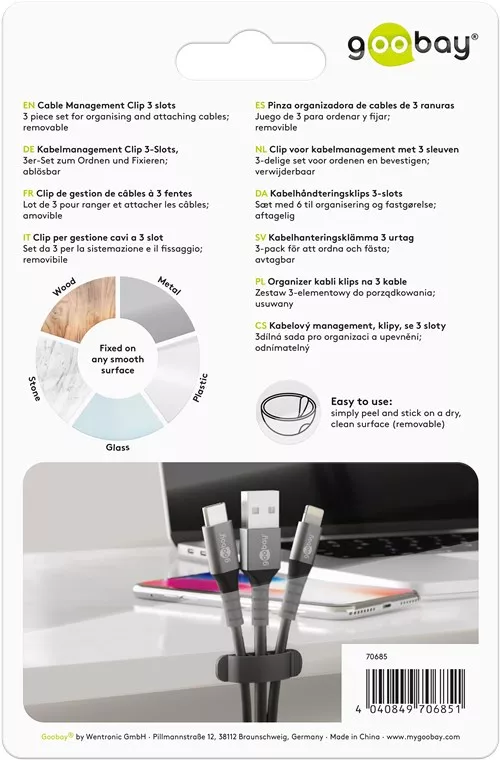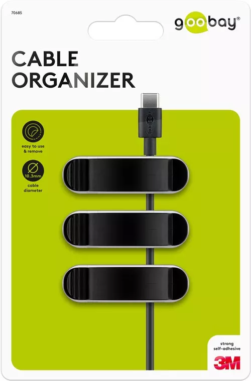 Setul de 3 cleme Goobay negre este ideal pentru organizarea eficienta a cablurilor, prevenind incurcarea si deteriorarea acestora, asigurand un aspect ordonat si functional in orice spatiu.