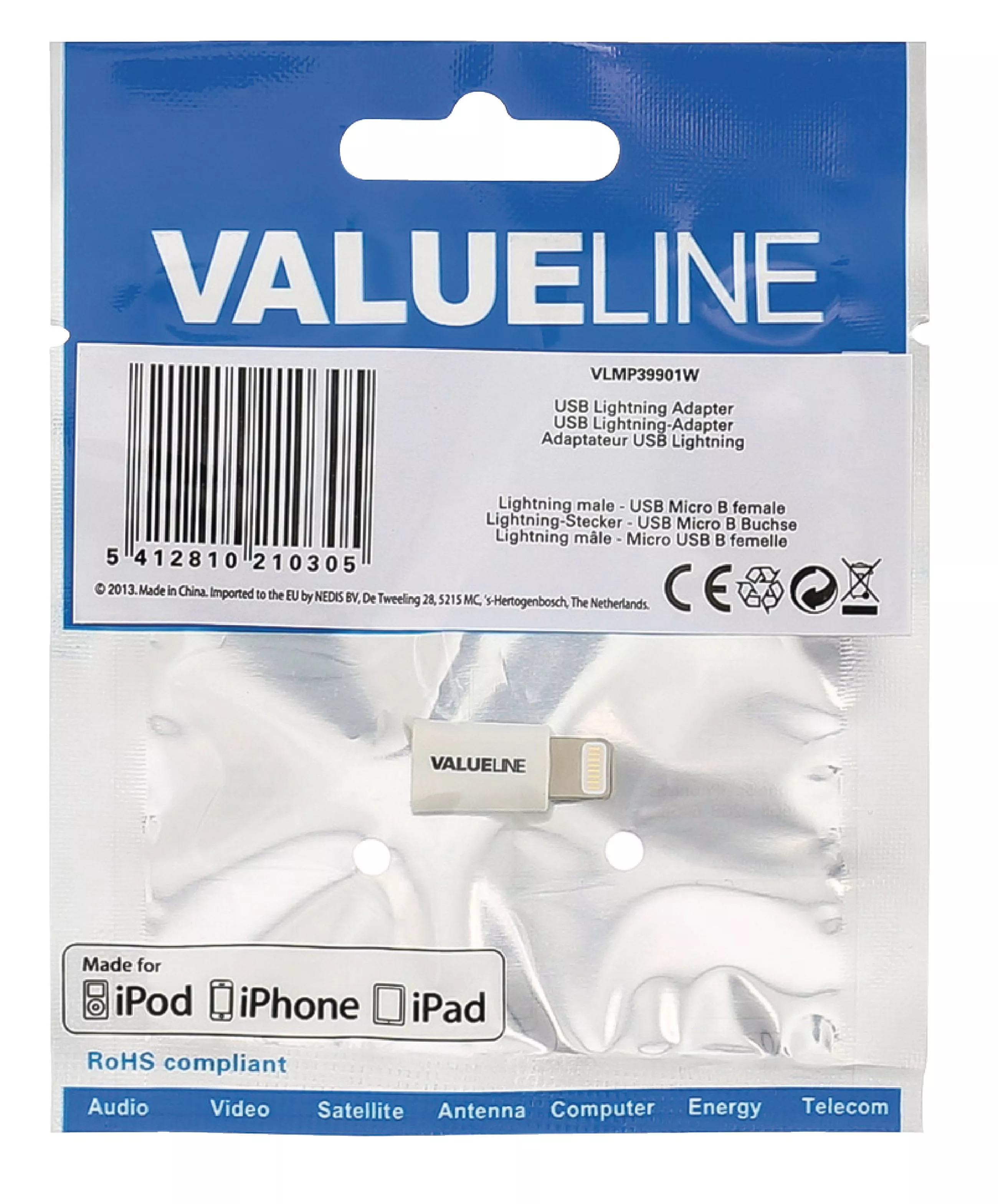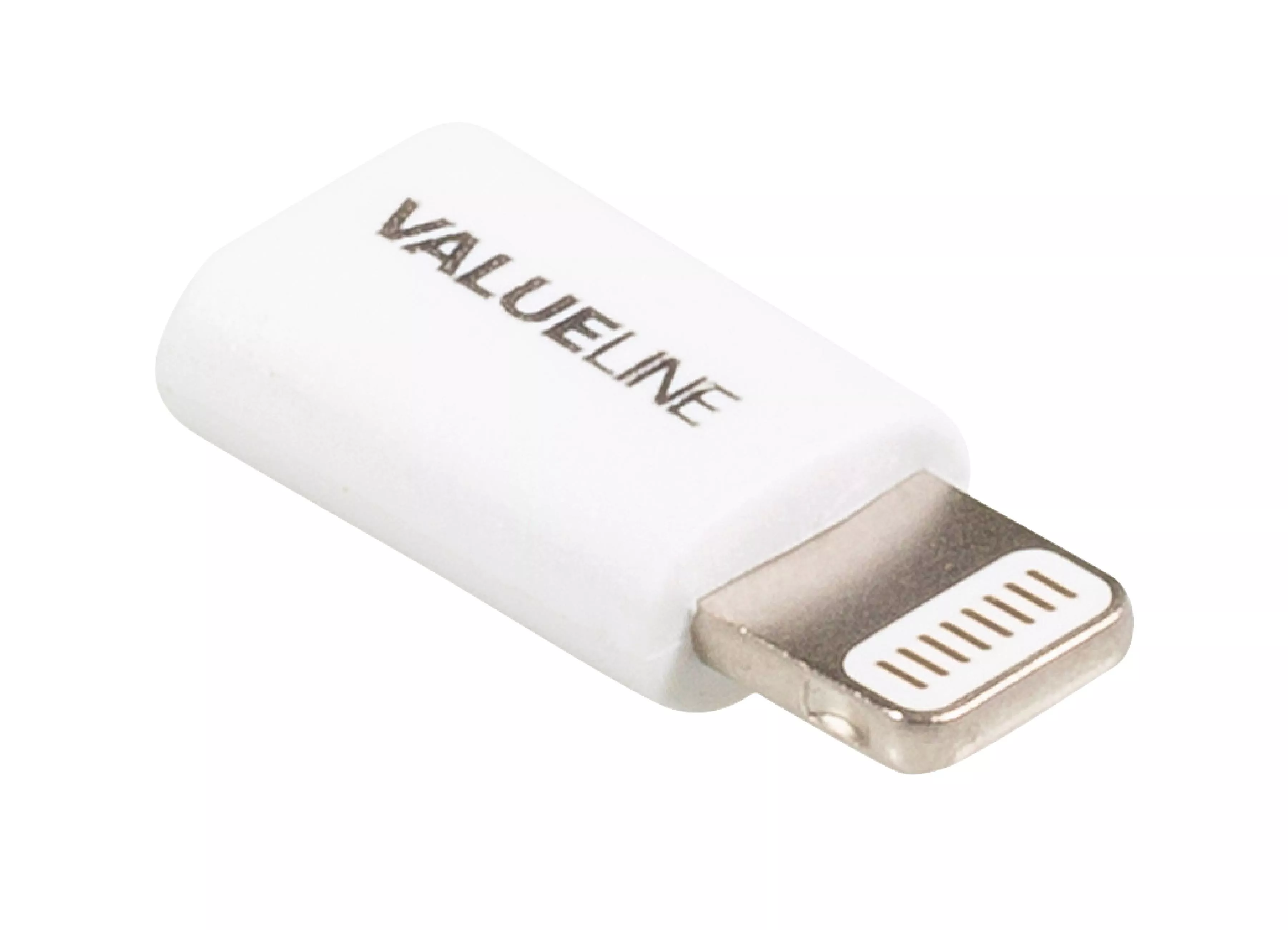 Adaptorul Valueline oferă compatibilitate între cablurile micro USB și dispozitivele Apple cu port Lightning, într-un design alb discret și durabil.