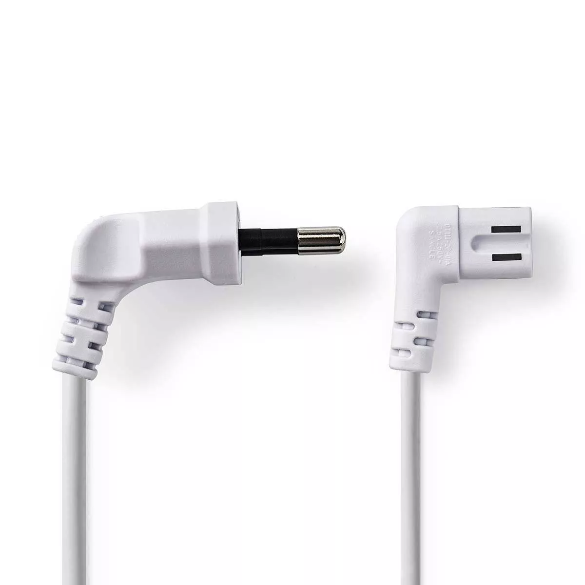Cablu de alimentare de înaltă calitate, cu conector Euro tata cotit și 2 pini IEC-320-C7, lungime 3 metri, culoare albă, ideal pentru conectarea sigură și eficientă a echipamentelor electronice.