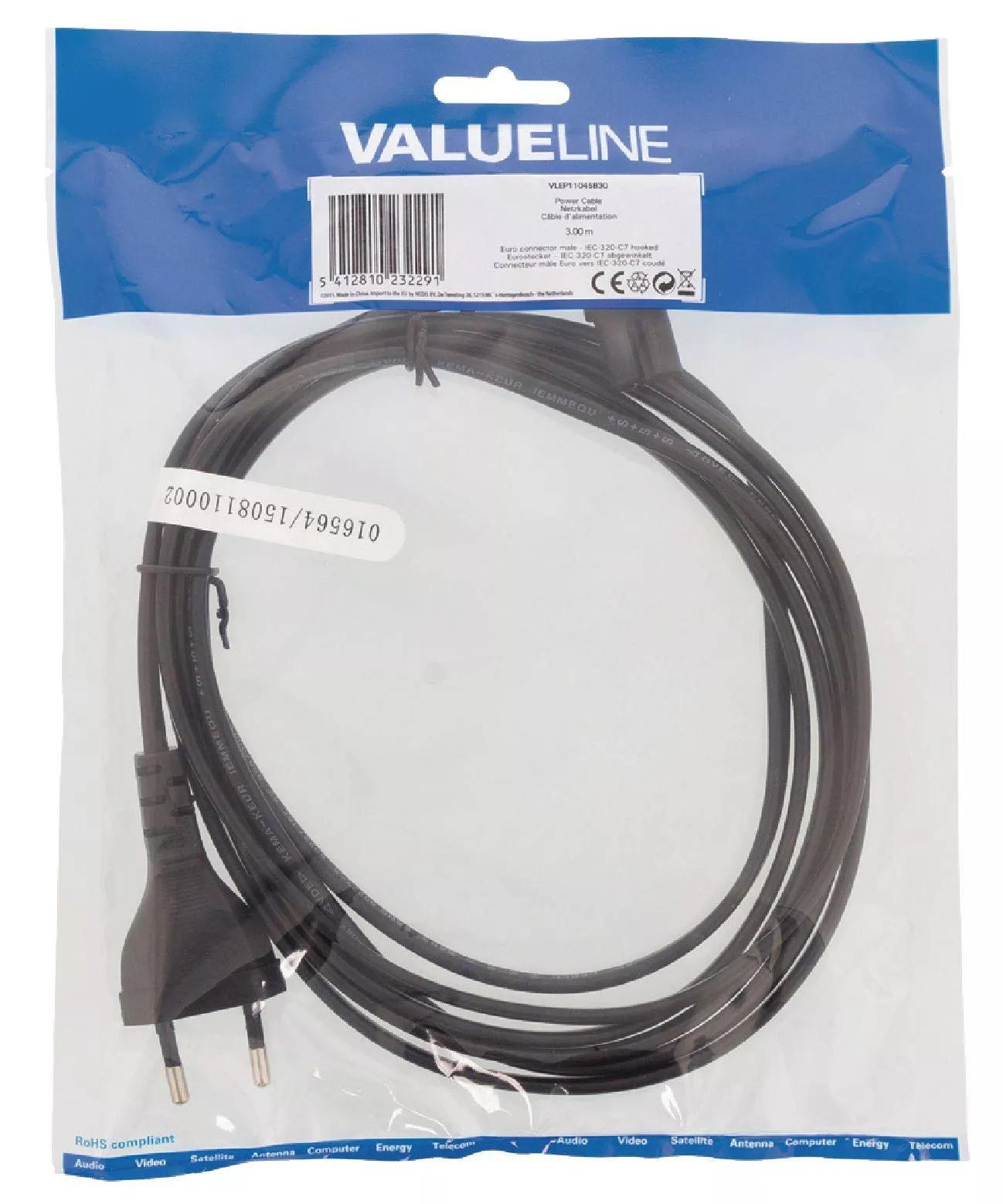 Cablu de alimentare de 3 metri cu priza tata Euro cu 2 pini, proiectat pentru conectarea dispozitivelor electronice la sursa de alimentare. Modelul Valueline oferă o soluție fiabilă și durabilă, cu un conector în unghi pentru o instalare facilă în spații restrânse.