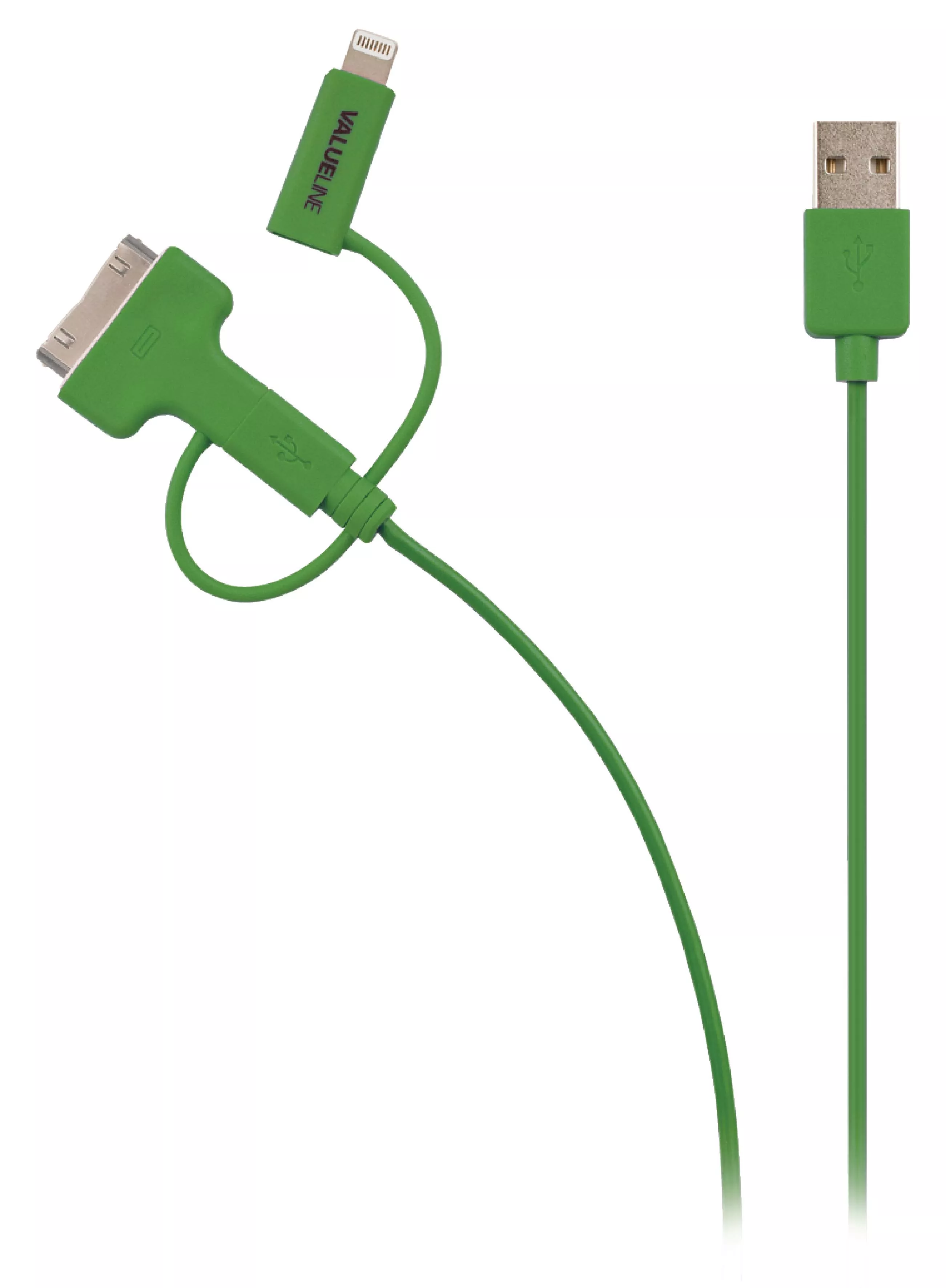 Acest cablu multifunctional verde Valueline ofera conectivitate rapida si fiabila pentru dispozitive cu port micro USB, Lightning si Apple Dock 30 pini, fiind ideal pentru alimentare si transfer date prin USB 2.0 pe o lungime de 1 metru. Realizat din cupru de inalta calitate, asigura o transmisie stabila si durabilitate sporita.
