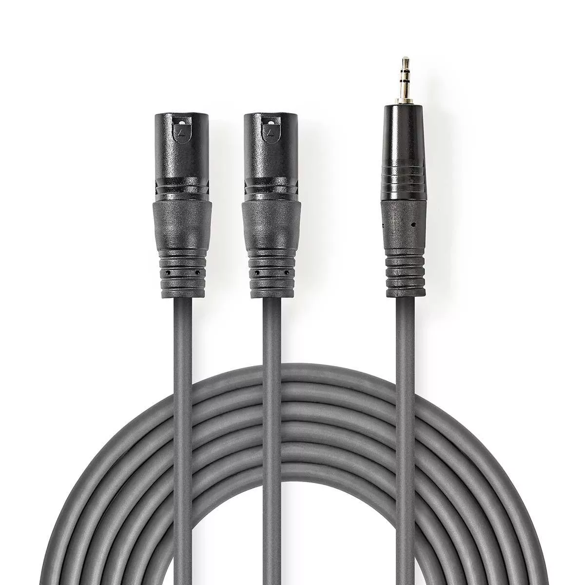 Cablu audio stereo de înaltă calitate cu conectori 2x XLR 3-Pin tata la 3.5 mm Jack tata, lungime 1.5 metri, ideal pentru conectarea echipamentelor audio profesionale și de consum. Design robust și flexibil, cu un înveliș gri durabil ce asigură stabilitate semnal și rezistență la uzură.