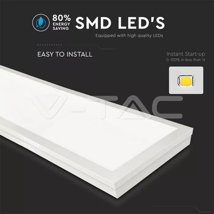 Panoul LED V-TAC de 40W oferă o lumină alb rece de 6500K cu o intensitate de 4000 lumeni, ideal pentru spații comerciale și birouri. Cu dimensiunile de 120x30 cm, panoul este subțire și ușor de instalat, având protecție IP20 pentru utilizare în interior.