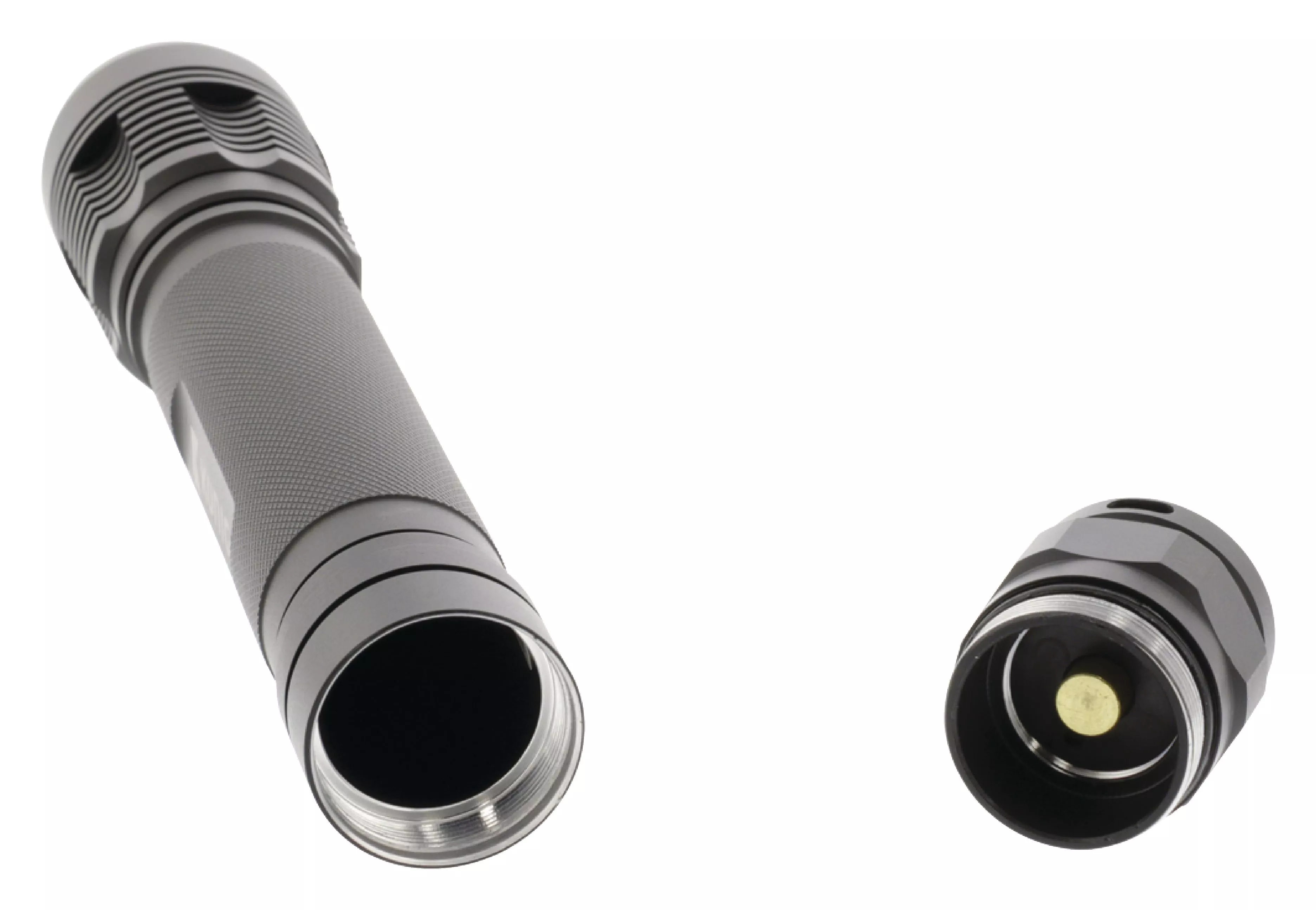 Lanterna Konig cu carcasa robusta din aluminiu negru ofera o iluminare puternica si eficienta prin LED-ul sau de 10W, fiind alimentata de o baterie tip C R14, ideala pentru utilizare indelungata si in conditii dificile.