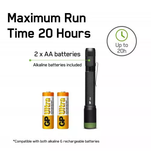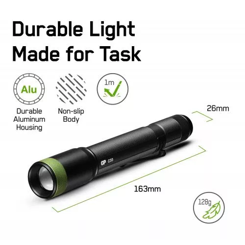 Lanterna LED GP C33 oferă o lumină puternică de 150 lumeni, fiind alimentată de două baterii AA, ideale pentru utilizare zilnică. Designul compact și carcasa rezistentă asigură durabilitate și manevrabilitate confortabilă în orice situație.