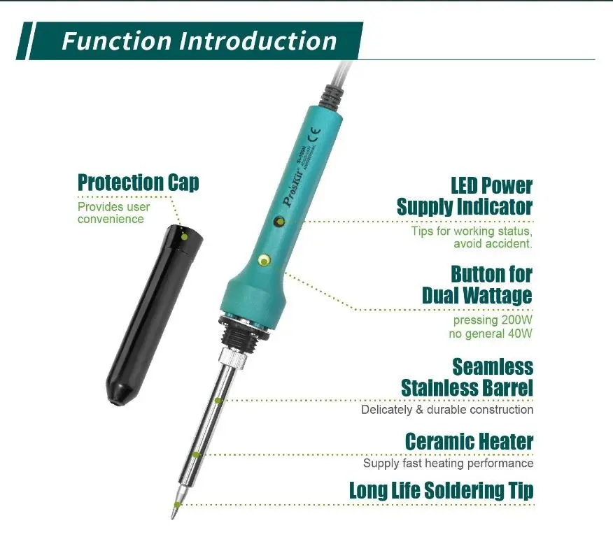 Letconul de lipit Pro`sKit SI-109B este echipat cu un element ceramic care asigura o incalzire rapida si eficienta, avand o putere reglabila intre 40 si 200W si o lungime de 20 cm pentru o manevrabilitate optima.