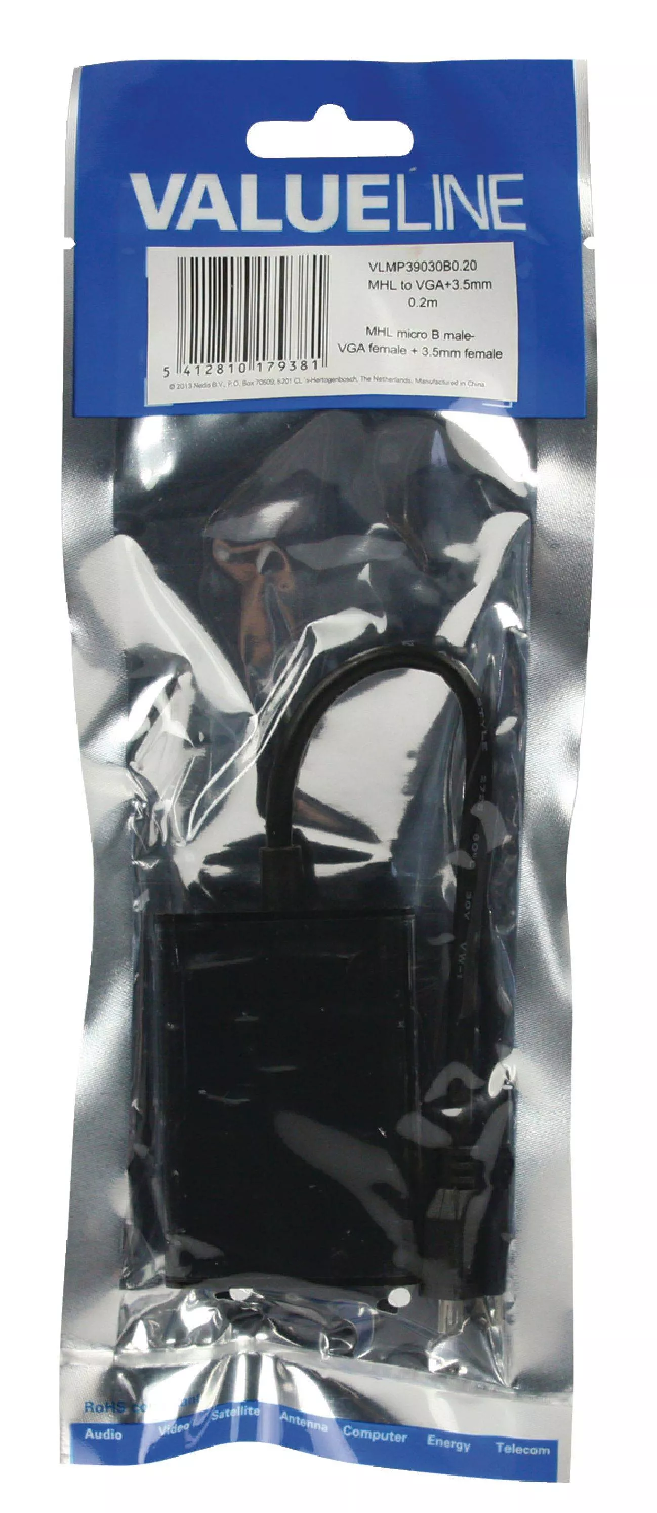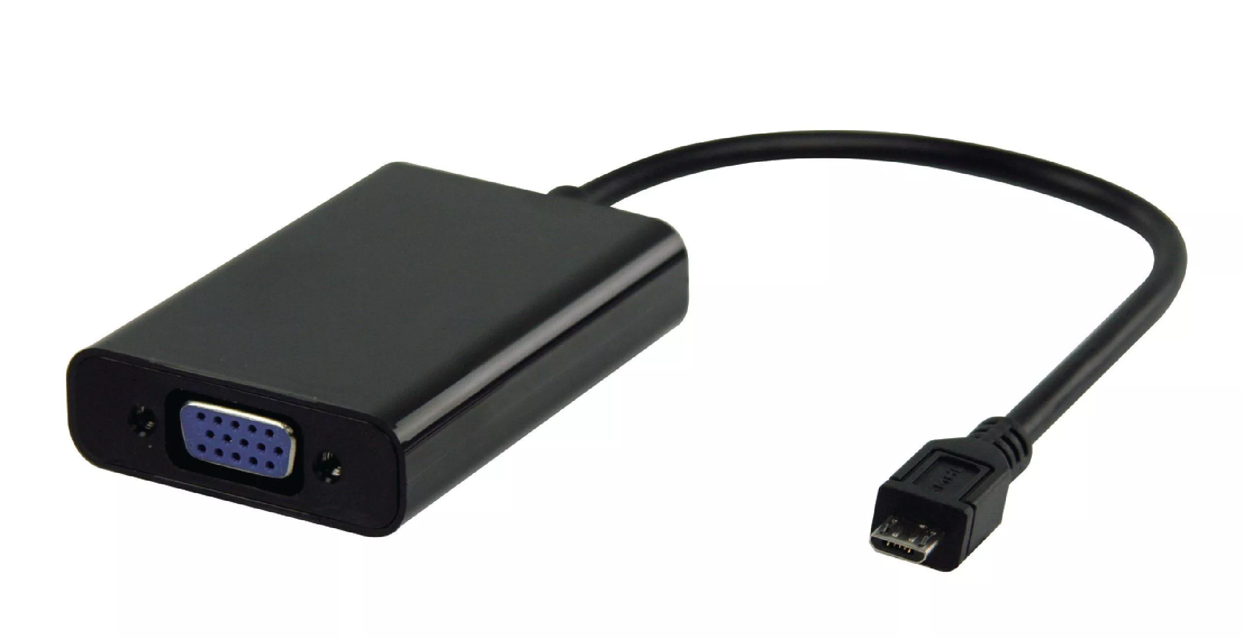 Cablu adaptor compact pentru conectarea dispozitivelor mobile cu port micro USB 5 pini la monitoare sau proiectoare VGA, cu ieșire audio prin jack 3.5 mm, lungime 0.2m, marca VALUELINE.