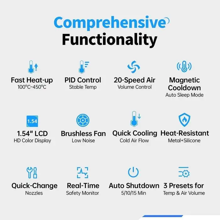 Pistol cu aer cald FNIRSI SAG-55 S 550W este destinat dezlipirii, reparatiilor electronice si prelucrarii termice precise. Echipat cu microcontroler PID, permite reglaj precis al temperaturii intre 100–450 °C si debit de aer ajustabil 1–20 niveluri, fara perii. Senzorul magnetic activeaza incalzirea la ridicare si standby la returnare, iar functia de racire asigura o utilizare in siguranta.