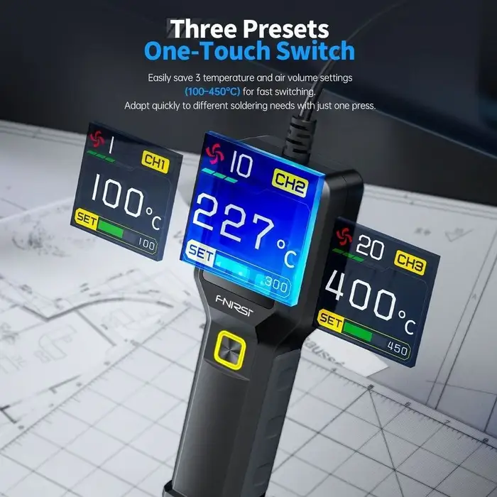 Pistol cu aer cald FNIRSI SAG-55 H 550W este un instrument pentru dezlipire, prelucrare termică și reparații electronice. Dispune de control precis al temperaturii între 100 °C și 450 °C și debit de aer reglabil până la 80 L/min cu 20 niveluri. Ecran LCD de 1.54 inch (240 × 240 pixeli) afișează temperatura și setările de ventilație, cu reglaj rapid.