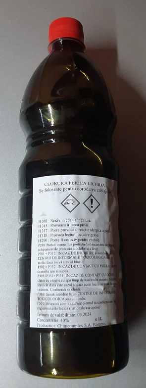 Clorura ferica este un compus chimic utilizat in numeroase aplicatii industriale si de laborator, avand o concentratie de 40% in solutie. Este un agent eficient pentru purificarea apei, tratarea apelor uzate si in procesele de coagulare.