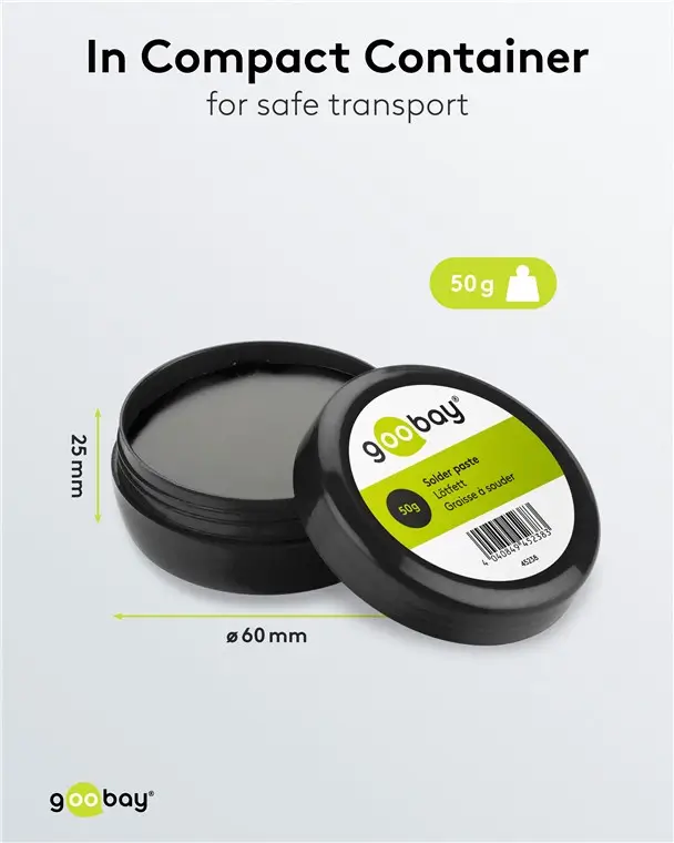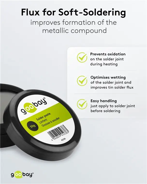 Pasta de lipit Goobay de 50g, pe bază de clorură de zinc, este ideală pentru realizarea de conexiuni precise și durabile în domeniul electronicii. Formula sa specială asigură o lipire rapidă și eficientă a componentelor electronice, facilitând lucrul chiar și în spații restrânse.