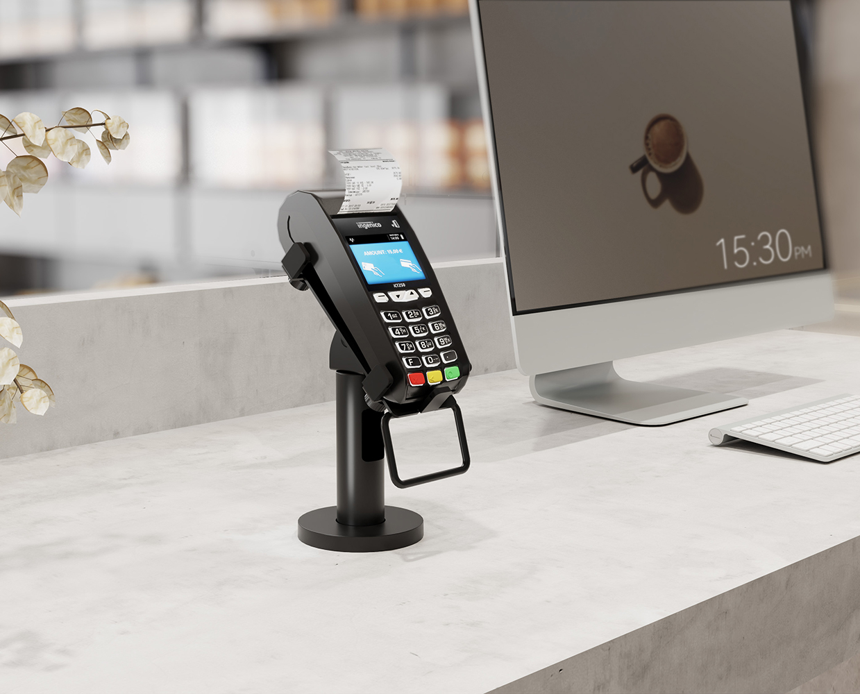 Acest suport montabil pe masă este soluția practică și sigură pentru terminalele de plată cu card. Compatibil cu majoritatea modelelor, oferă flexibilitate maximă prin rotire completă la 360° și înclinare de ±45°, asigurând o utilizare comodă atât pentru clienți, cât și pentru personal.
