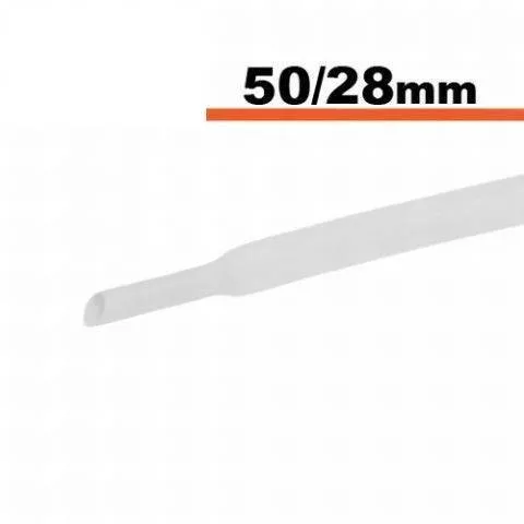 Tubul termocontractibil alb, cu diametrul inițial de 50mm redus la 25mm, lungime 0.5m, oferă protecție optimă cablurilor și conexiunilor electrice împotriva umezelii, prafului și deteriorărilor mecanice, asigurând izolarea și durabilitatea în timp.